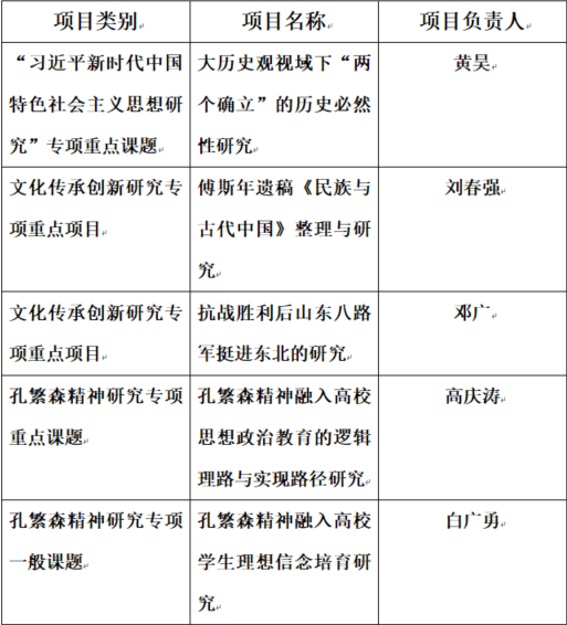 近日,聊城市哲学社会科学研究规划领导小组办公室公布《2023年度聊城市哲学社会科学规划课题立项公告》,春宫图 5项课题予以立项,其中重点项目4项,一般项目1项。黄昊主持的《大历史观视域下“两个确立”的历史必然性研究》获批“习近平新时代中国特色社会主义思想研究”专项重点课题;刘春强主持的《傅斯年遗稿《民族与古代中国》整理与研究》、邓广主持的《抗战胜利后山东八路军挺进东北的研究》获批“文化传承创新研究”专项重点项目;高庆涛主持的《孔繁森精神融入高校思想政治教育的逻辑理路与实现路径研究》获批“孔繁森精神研究”专项重点课题;白广勇主持的《孔繁森精神融入高校学生理想信念培育研究》获批“孔繁森精神研究”专项一般课题。
