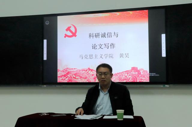 黄昊院长紧扣当下实际,深入剖析了科研学术不端的危害,强调了防范学术不端的重要意义,解读了查处学术不端行为的政策规定。他讲到研究生必须深刻领会学术道德的重要性,要求同学们必须坚持正确的政治方向及价值取向,严于律己,加强学术道德修养,杜绝学术造假行为,提高思想认知,做到求真务实,坚持做到“守住底线、不碰红线、追求高线”的原则。与此同时,他指出,在学术论文写作过程中要有针对性地选取具有时代性和学术价值的“问题”作为自己学术论文的选题。论文写作要注意谋篇布局,做到合理地起承转合,以论点作为行文的驱动,围绕论点展开论述。他结合自身论文写作经验就如何写好科研论文给出了合理建议,特别是针对如何写好文献综述进行了详细阐述,指出论文写作具有长期性和反复性,必须要做好前期的资料搜集和笔记整理的工作。