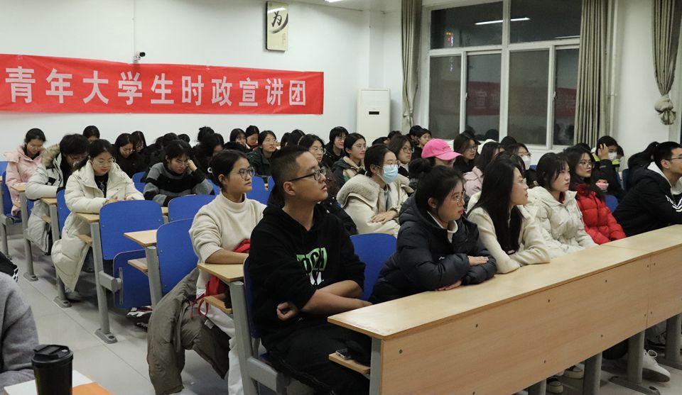 12月19日,春宫图 青年大学生时政宣讲团成员钟翠、孙富硕在6号楼C205室作习近平新时代中国特色社会主义思想宣讲,政治与公共管理学院2023级学生代表参与此次宣讲会。