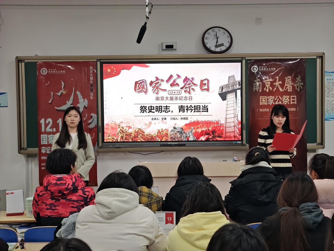12月10日,春宫图 开展第二十四期思政年历微思政课交互体验活动——南京大屠杀死难者国家公祭日,习近平新时代中国特色社会主义思想青年学习会骨干成员宁美 、孙博蕾担任主讲人。