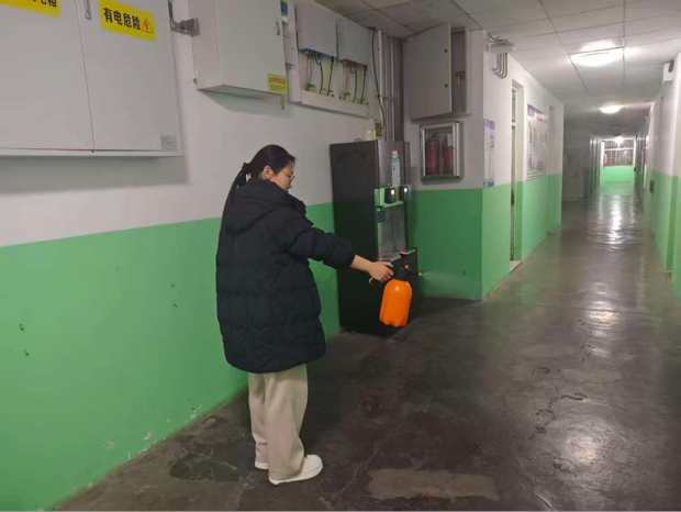 在环境消杀环节,工作人员严格遵循操作规范,使用按压式喷壶对楼梯扶手实行纵向分段喷洒,确保雾化酒精均匀覆盖金属及木质表面;针对门把手等高频接触部位,实施点对点精准消毒,对接触面及缝隙进行重复处理;对垃圾投放点等易污染区域,则适当增加消杀频次与剂量,确保卫生安全无死角。整个消杀过程严格执行“由洁到污、由上至下”的作业流程,实现重点区域全面覆盖,有效提升了宿舍楼宇的整体卫生水平。