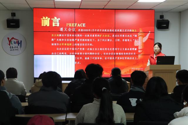 宣讲会在电影《遵义会议》的片段中拉开序幕,这部电影不仅唤起了大家对遵义会议历程的回忆,更寓意着在新时代背景下,青年学子应继承和发扬前辈们的奋斗精神。随后,宣讲团成员围绕遵义会议的历史背景、召开过程和决议内容、历史地位以及精神内涵四个环节系统剖析了遵义会议的重大意义,深刻诠释了遵义会议精神的核心要义。宣讲团成员指出,遵义会议是指在1935年1月中共中央政治局在贵州遵义召开的独立自主地解决中国革命问题的极其重要的扩大会议。这次会议强调一切从实际出发,尊重客观规律,实事求是地分析形势,制定正确的战略战术,标志着中国共产党开始独立自主地探索适合中国国情的革命道路。遵义会议在极端危险的时刻,挽救了红军和中国革命,是中国共产党历史上一个生死攸关的转折点,也为后来的中国革命、建设和改革提供了宝贵的思想财富。我们要运用好遵义会议历史经验,让遵义会议精神永放光芒。作为新时代的大学生,我们要传承和弘扬以“坚定信念、坚持真理、独立自主、团结统一”为基本内涵的遵义会议精神,不断铸牢信仰之基、补足精神之钙、把稳思想之舵,自觉做共产主义远大理想和中国特色社会主义共同理想的坚定信仰者、忠实实践者。