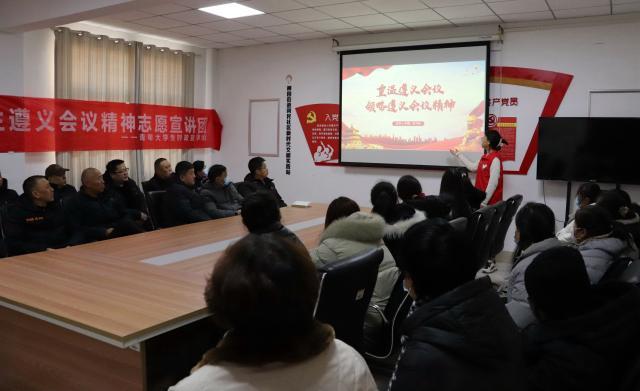 雄关漫道真如铁,而今迈步从头越。宣讲团成员立足专业特色,借助多媒体课件和视频等载体,向大家详细介绍了遵义会议的历史背景、主要内容和重要意义。宣讲团成员指出,遵义是红色圣地、革命老区,红军长征在这里转战三个多月,召开了彪炳史册的遵义会议,开始形成以毛泽东同志为核心的党的第一代中央领导集体,开启了党独立自主解决中国革命实际问题的新阶段。遵义会议所体现出“实事求是、独立自主、民主团结、坚定信念、敢闯新路”的精神不仅是我们党的重要思想武器,也是新时代党和国家事业发展的强大精神力量,对于我们的工作和生活都具有重要的指导意义。当代青年要继续弘扬遵义会议精神,不断提高自己的思想觉悟和工作能力,为实现中华民族伟大复兴而努力奋斗。