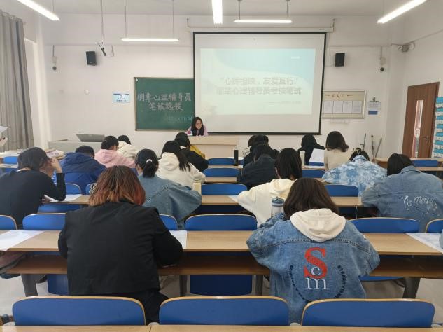 让心灵沐浴阳光,让快乐充溢胸膛。朋辈心理辅导员选拔分为笔试和面试两个部分,心理部负责人提前在21级各班进行宣传,下发选拔通知,鼓励同学们积极参与,踊跃报名。同学们认真学习心理辅导知识,不断熟悉朋辈心理辅导的工作内容、培训机制、工作要求。心理部负责选拔的各项工作,监考人员引导同学们有序入场并分发笔试试题,严肃考试纪律,保持考场安静,提醒同学们注意考试时间,上交手机,杜绝作弊。同学们以认真的态度、缜密的思维、工整的书写完成试题,按时上交考卷。心理部负责人秉承着公平公正公开的原则批改试卷,考察同学们的心理辅导能力,经过综合考量,张梦鸽和王娟等同学进入面试。