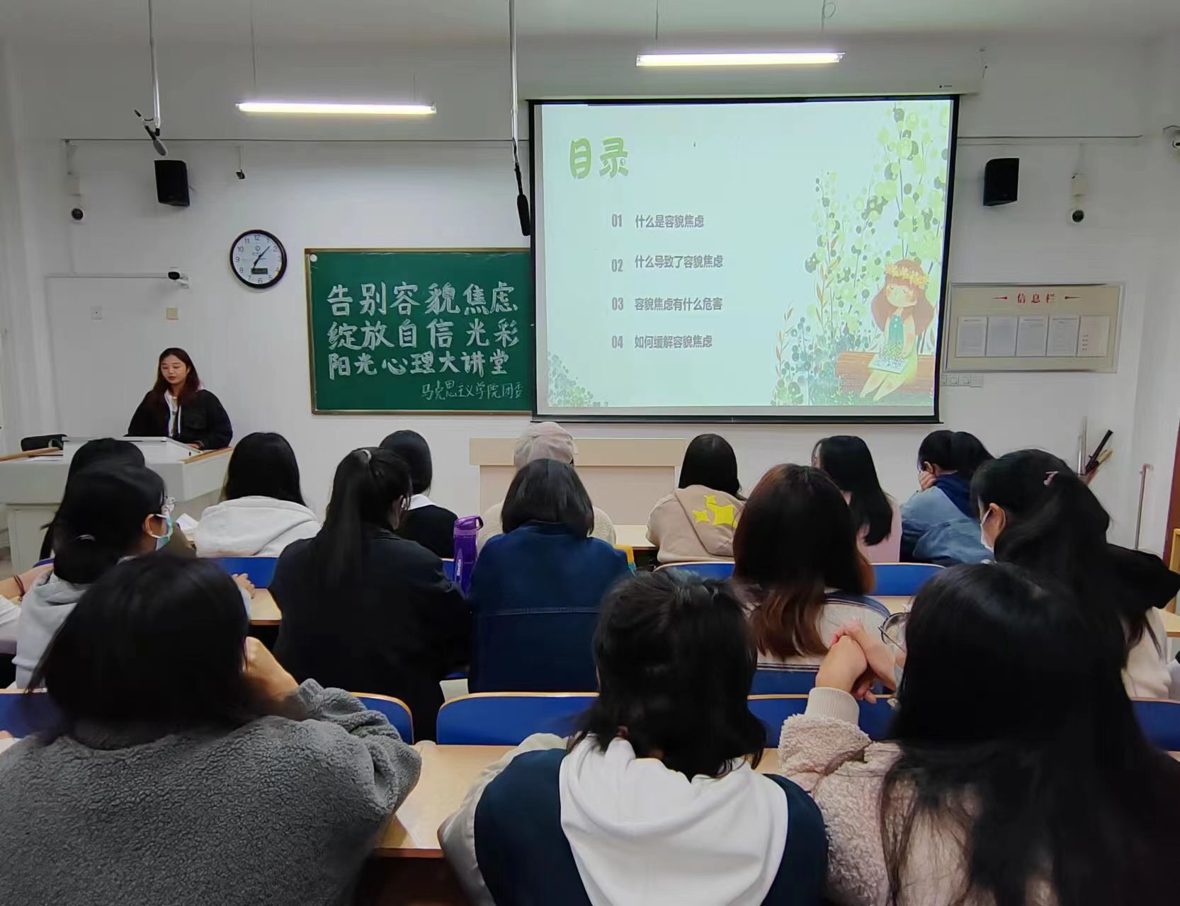 为丰富同学们的课余生活,增强心理抗压能力,11月1日,欲神幻想 于东校区6#A201举办“告别容貌焦虑,绽放自信光彩”阳光心理大讲堂活动。教育科学学院研究生张红亚担任主讲人。