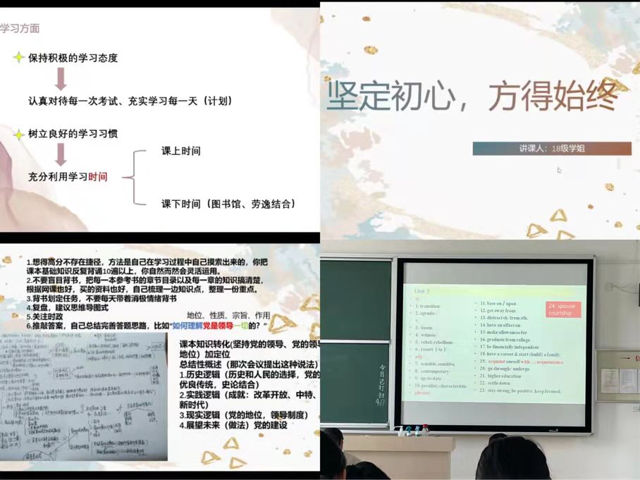 本次考研经验交流会邀请到思想政治专业2022届优秀毕业生王冠文和王一喆向同学们分享学习方法及备考经验。王冠文从推免资格、推免准备、推免择校三方面进行说明。她强调:同学们在学习中要保持积极的学习态度和良好的学习习惯,做好每日学习计划,注重劳逸结合;针对择校选择,她指出需双向考虑,综合选择,从个人能力、目标院校、地域情况等多方面进行考量。王一喆从考研的准备方面切入,主要向同学们介绍考研择校、学习准备以及心态调整的相关事项。她结合自身经历分享英语学习方面的经验,强调学习不要求快、不能自我感动,要脚踏实地、稳中求胜;心态调整方面,王一喆表示不要把考研当成一种负担,而将它当成生活的一部分,从而更好地应对考研中的挫折。最后,两位优秀毕业生希望同学们在考研路上能够努力拼搏,找准方向,冲破艰难,调节心态,将奋发有为的考研接力棒传递下去。