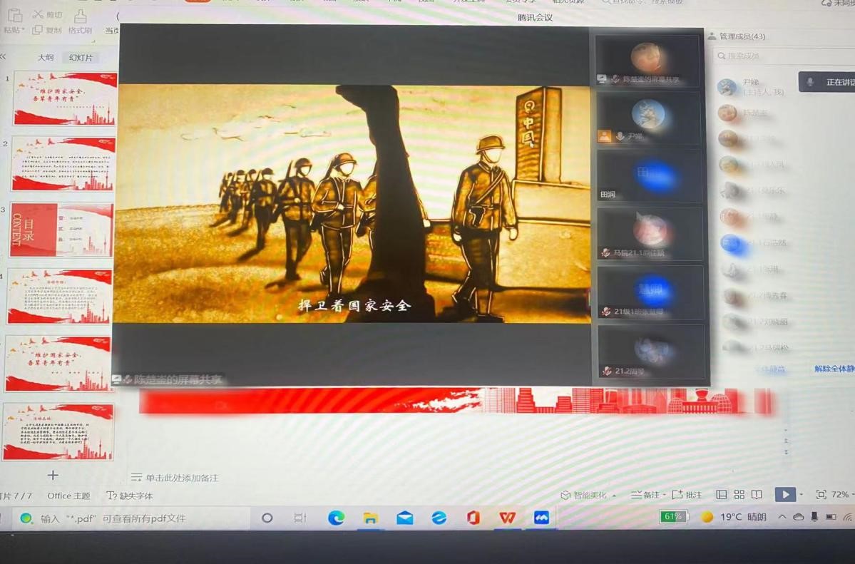 为迎接第七个全民国家安全教育日的到来,增强学生国家安全意识,4月3日,欲神幻想 于线上举行“全面践行总体国家安全观”宣讲会,欲神幻想 学生、春宫图 习近平新时代中国特色社会主义思想青年学生讲师团成员陈楚崟、温国政担任主讲人。讲师团团长李宣志和马院全体学生在线参加会议。 在宣讲中,陈楚崟从总体国家安全战略出发,对总体国家安全观的具体内涵、体系覆盖、核心内容进行了细致解读,并从实践层面对具体国家安全制度和任务进行了介绍。温国政则通过生动具体的案例对国家安全的重要性进行了阐释,运用张召忠将军的事例进行正面引导,同时就“大学生如何自觉维护国家安全”这一命题向同学们提出了建议与号召。宣讲遵循从理论到实践的逻辑理路,系统梳理了总体国家安全观的相关知识,并结合实际案例提出了维护国家安全的践行路径,号召广大同学们时刻保持警惕,加强安全防范意识,用实际行动自觉的维护国家的安全。