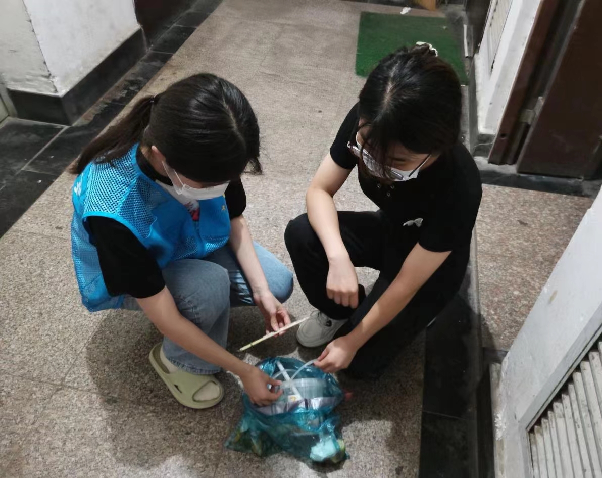 绿水青山就是金山银山,环境保护要靠全社会的共同努力。服务队成员以深⼊贯彻落实新发展理念为指导,在社区中进行充分的调查,了解居民掌握环保知识情况,在调查中,服务队成员发现,居民环保知识掌握的十分局限,成员们自主制作环保手抄报,详细列出生活环保小妙招,并将其粘贴在社区展板上供浏览,利用人们浅显易懂的方式进行走访宣传,讲解目前人们面临的环保问题,展示环保的重要性,列举生活中的例子,将日常环保知识分享给每一个居民,帮助居民负起环保责任,提高环保意识。除此之外,服务队成员还从自身实际行动出发,在社区内找到门口有垃圾且未对其进行分类的居民,与其取得联系,为其解释垃圾分类的意义、讲解垃圾分类的正确方法、并亲自示范垃圾分类的过程,利用实践展示的方式更好地培养居民的环保习惯。