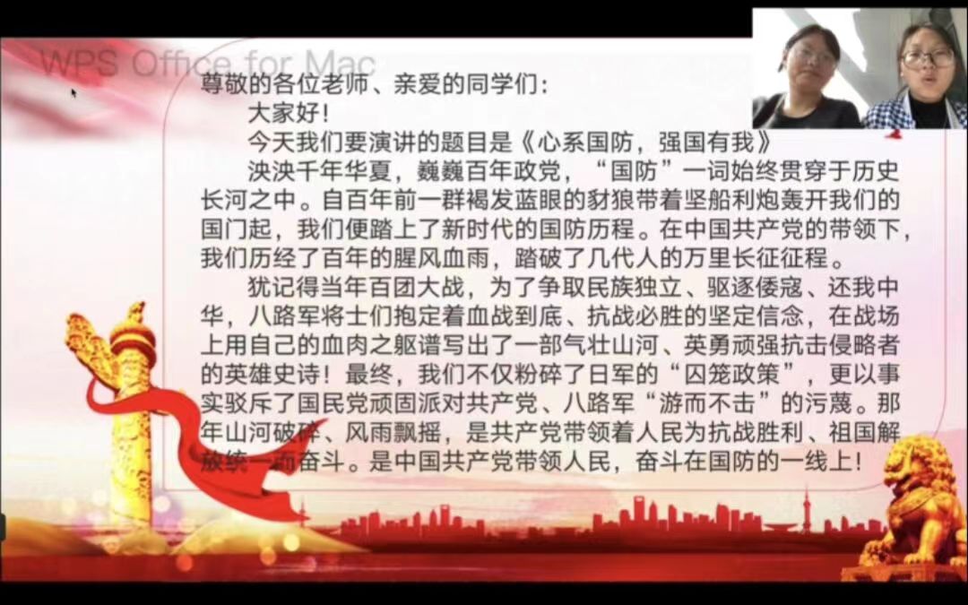 此次主题演讲活动以线上形式展开。张琳以建军一百年奋斗目标为切入点,鼓励同学们结合自身对国防建设的了解,以录制视频的形式表达出新青年对国防建设的看法。同学们围绕演讲主题,从不同的角度诠释自己的独特见解,展现自我风采。他们视频中的精彩演讲不仅抒发出新时代青年胸怀祖国、放眼世界的远大理想和心系国防、立志报国的豪情壮志,而且展现出当代大学生奋发向上的青春力量。其中,安雅茹在视频中以多样的形式讲述了“致富不忘国防,和平不忘忧患”的内容,回顾了过去中国人民的屈辱历史,并强调国防建设的重要性,赞颂了国防建设的辉煌成就。