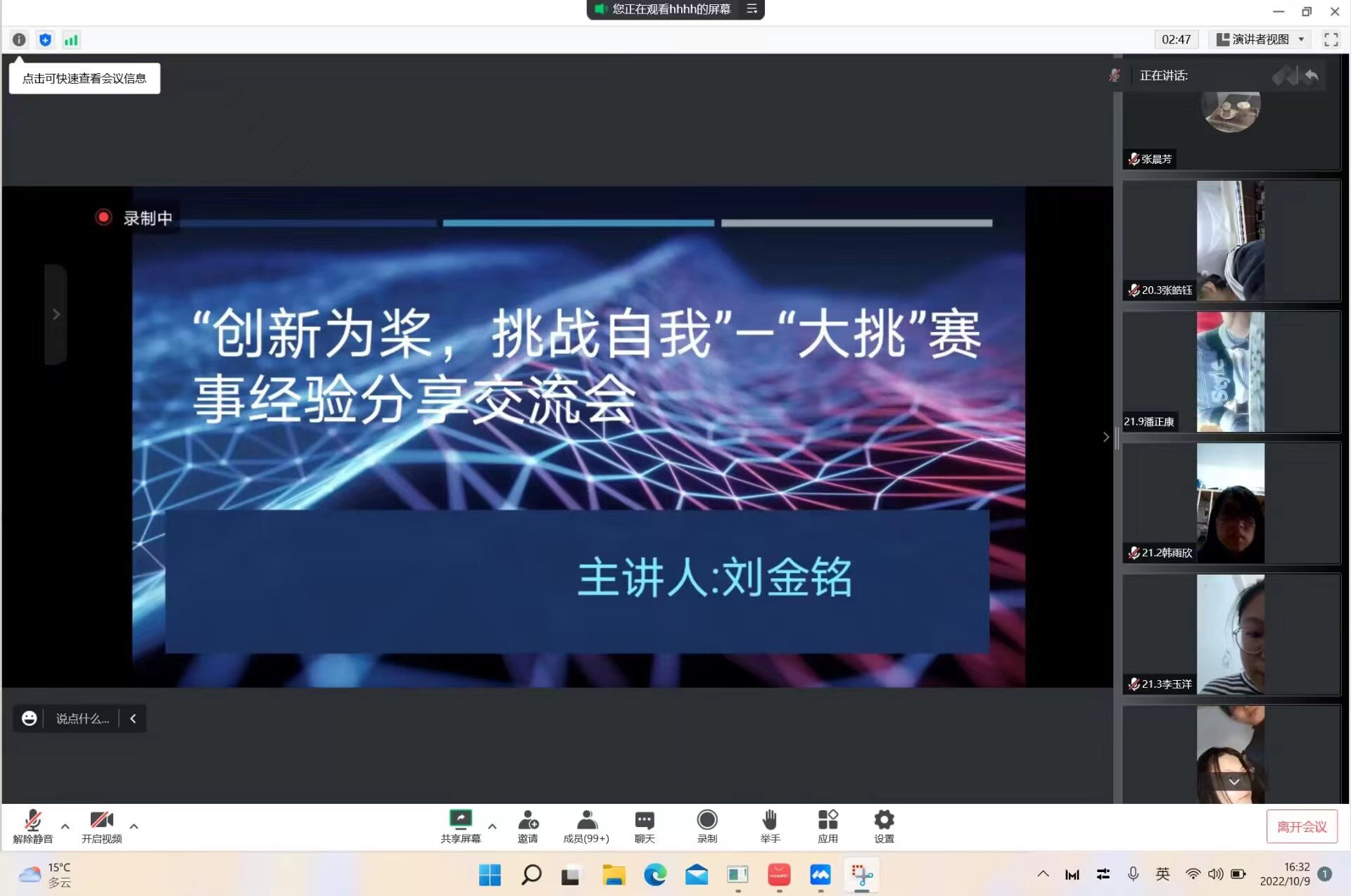 本次活动采用线上方式进行。刘金铭就挑战杯赛事介绍、项目组织开展过程、收获与感悟三个方面,分享了其个人比赛过程及经验。刘金铭向同学们介绍了挑战杯作品分类及其评审侧重点,并从题目、前期工作、调查报告正文、调查设计及试验四个方面规范了调查报告的结构,着重介绍哲学社会科学类社会调查报告和学术论文的要求,详细介绍申报经验。她指出,选题是关键环节,一方面应结合自己的专业知识,另一方面应立足于现实社会发展要求。同时,刘金铭向大家分享参赛历程以及参赛问题,在任务分配方面,她指出应发挥每个成员的长处,增强团队合作意识在调查结果的分析和建议,注意分析的规范性以及建议的可行性、前瞻性。在交流会的最后,她鼓励青年学生放下思想包袱,勇敢尝试,积极参加科创竞赛,开阔视野,培养团队精神,奠定人生发展方向。