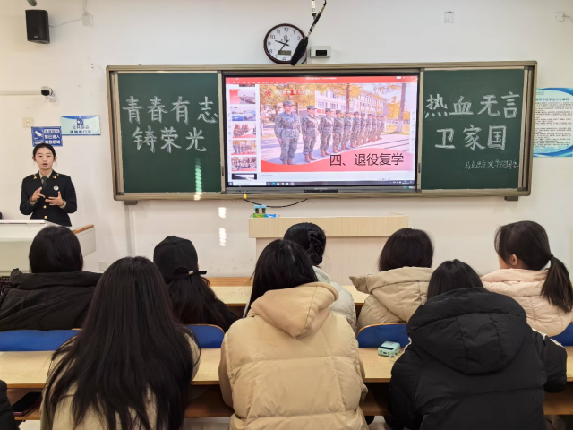 在经验分享环节中,周佳依学姐以入伍初衷、军旅生活以及退伍后重返校园的心路历程为切入点,向同学们详细叙述了自己在部队的日常训练与生活,清晰地呈现出作为一名普通大学生逐步成长为合格军人的蜕变轨迹,让同学们了解到当代大学生参军入伍对个人成长与国家发展的重要意义。同学们对周佳依学姐的分享回以热烈的掌声,纷纷表示此次活动使他们全面了解征兵政策,并承诺将积极响应国家号召,投身国防建设,为国家安全和发展贡献自己的青春和力量。