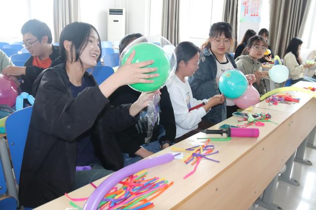活动紧紧围绕“技能提升,爱心传递”的主题展开。在负责人的组织下,参与者每六人自行分组,有序领取自己喜欢的气球样式。陈九阳通过播放手工制作视频,向同学们展示爱心气球的制作方法和技巧,并通过现场演示和针对性指导,加深同学们对每个制作步骤的理解。随后,同学们便投入了“沉浸式”手工制作,他们充分发挥想象力和创造力,时不时交流想法和建议,精心设计图形样式,搭配多彩的颜色,设计出了独具特色、各式各样的气球。