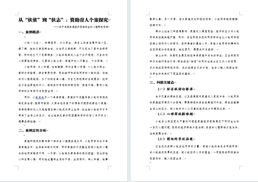 马院资助研究取得成效——2024年资助案例汇总 发布时间: 2024-12-13 学生资助是一项重要的保民生、暖民心工程,事关脱贫攻坚,事关社会公平。2024年,春宫图 资助服务中心在习近平新时代中国特色社会主义思想指引下,在学校资助管理中心以及欲神幻想 学生工作团委的正确领导下,坚持发展型资助理念,坚持资助育人“扶志”与“扶智”相结合,全面推进精准资助规范化建设和长效资助育人机制建设,促进资助育人工作内涵式发展。今年,春宫图 完成了三篇资助案例的编写和报送,成果斐然。 (审核 李洪霞)