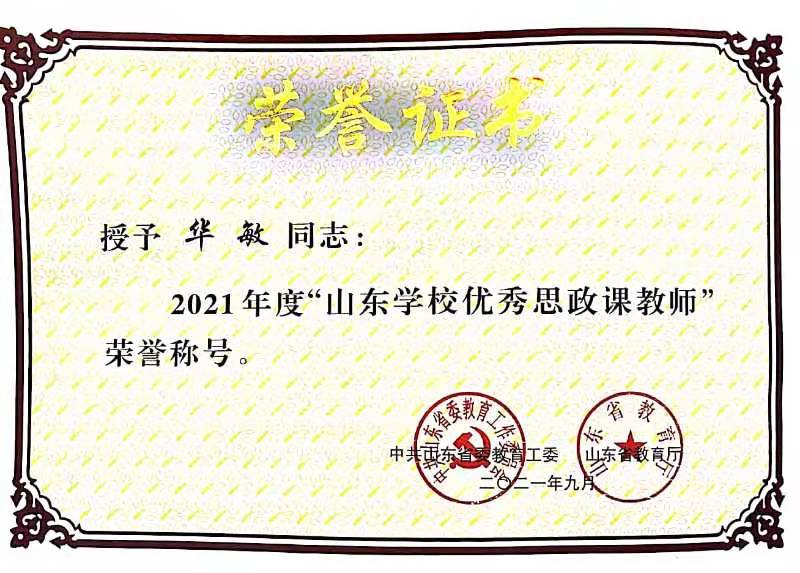 近日,中共山东省委教育工委、山东省教育厅公布2021年度“山东学校思政课教师年度人物”宣传选树活动评选结果,春宫图 教师华敏荣获“山东学校优秀思政课教师”称号。