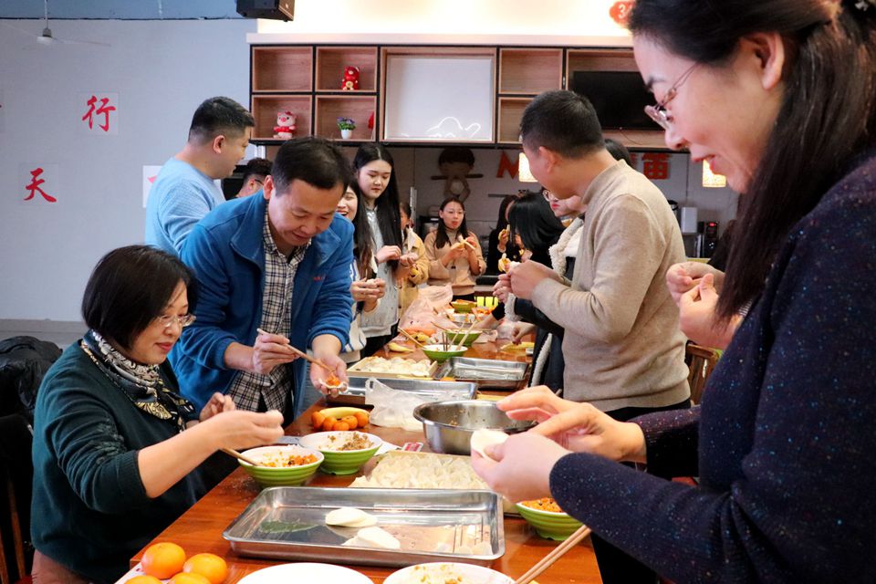 活动现场,餐厅工作人员为大家准备好了饺子皮、饺子馅等各种材料和工具。老师和同学们纷纷上手,展示自己包饺子的手艺,一起互聊家常,交流工作情况和日常生活,氛围其乐融融。