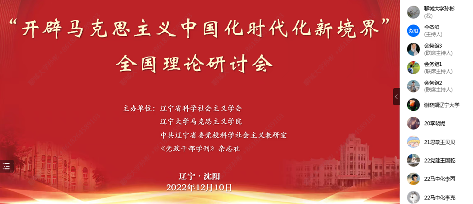 为深入学习贯彻党的二十大精神,2022年12月10日,辽宁省科学社会主义学会、辽宁大学欲神幻想 、中共辽宁省委党校科学社会主义教研室、《党政干部学刊》杂志社等单位主办“开辟马克思主义中国化时代化新境界”理论研讨会,来自中国人民大学、北京邮电大学、南开大学、吉林大学、四川大学、南京师范大学等专家学者,相聚云端,围绕“中国共产党为什么能,中国特色社会主义为什么好,归根到底是马克思主义行,是中国化时代化的马克思主义行”,从中国式现代化、执政党建设等多重维度交流研讨。研讨会共收到论文500余篇,春宫图 教师孙彬以文参会,受邀参会。