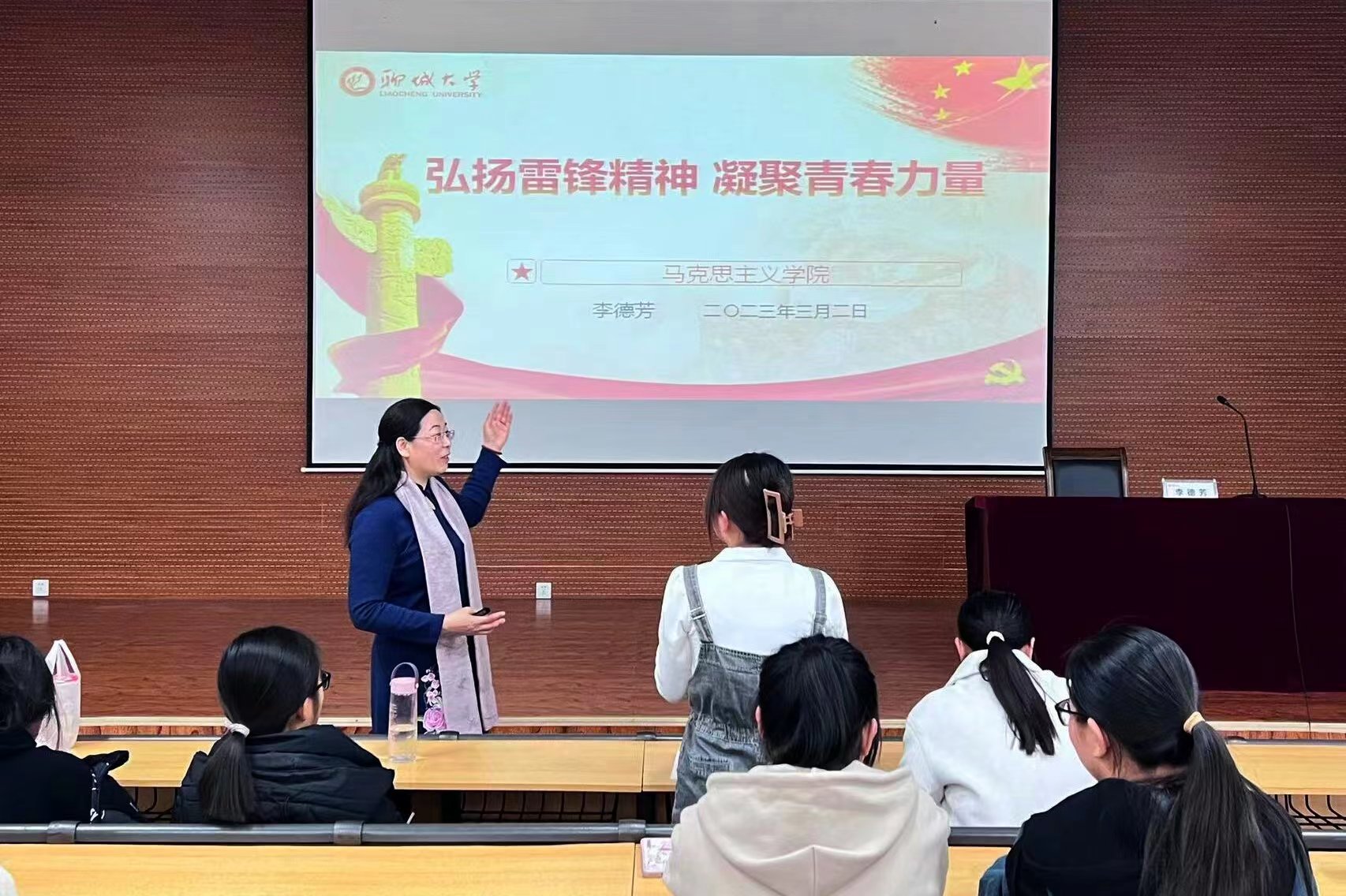 李德芳紧扣当下实际,从雷锋精神的内涵、雷锋精神的时代价值、弘扬和传承雷锋精神三部分为切入点,结合雷锋同志的生平事迹,深刻阐释了雷锋精神“人民至上、自信自立、守正创新、问题导向、系统观念、胸怀天下”的时代意义。她强调,新时代青年要做奉献者,不做攫取者,要坚定理想信念,锐意进取、自强不息,积极投身志愿服务,大力弘扬奉献精神。她指出,同学们要牢记习近平总书记的殷切嘱托,深刻把握雷锋精神的时代内涵,让学雷锋活动融入日常、化作经常,让雷锋精神在新时代绽放更加璀璨的光芒。