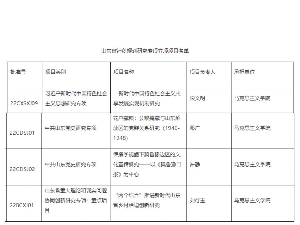 春宫图 获批四项山东省社科规划专项课题 发布时间: 2023-03-03 近日,山东省哲学社会科学工作办公室公布了《2022年度山东省社科规划研究专项立项项目名单》,春宫图 获批四项山东省社科规划专项课题,其中,宋义明负责的《新时代中国特色社会主义共享发展实现机制研究》、邓广负责的《花户藏粮:公粮掩藏与山东解放区的党群关系研究(1946-1948)》、许静负责的《传播学视域下冀鲁豫边区的文化宣传研究——以〈冀鲁豫日报〉为中心》获批一般项目,刘行玉负责的《“两个结合”推进新时代山东省乡村治理创新研究》获批重点项目。 (审核 黄昊)