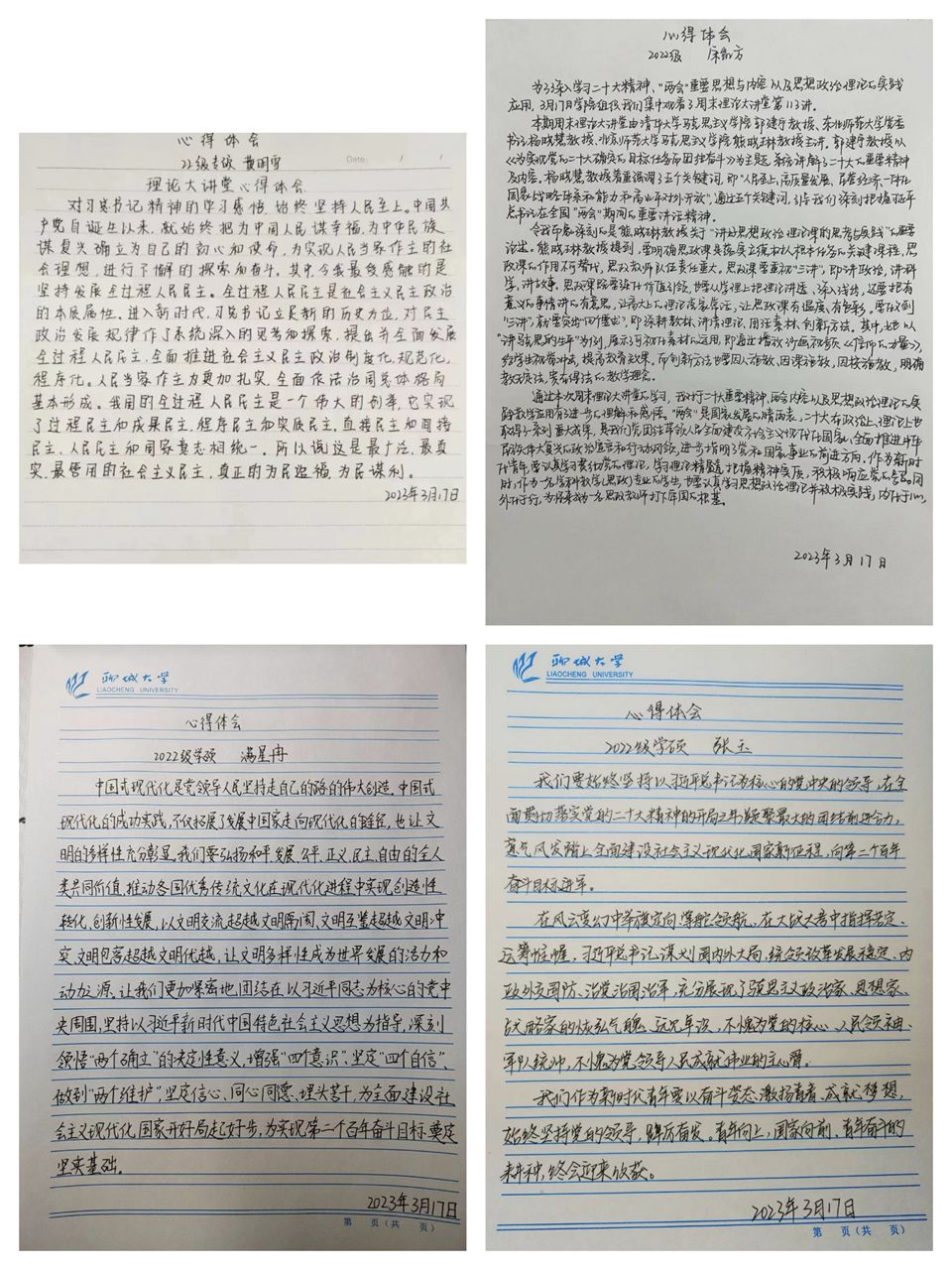 在观看的过程中,同学们专心致志听讲,认真记录。讲堂结束后,同学们根据三位老师的讲解纷纷发表了自己的意见,张玉同学谈到,新时代大学生要坚持发展全过程人民民主,党的奋斗的一切都是为了人民,要团结海内外中华儿女,坚持大团结大联合,在开局之年凝聚最大的团结前进合力,意气风发踏上全面建设社会主义现代化国家新征程,向第二个百年奋斗目标进军。满星冉同学表示,中国式现代化的成功实践,不仅拓展了发展中国家走向现代化的途径,也让文明的多样性充分彰显。我们要弘扬和平、发展、公平、正义、民主、自由的全人类共同价值,推动各国优秀传统文化在现代化进程中实现创造性转化、创新性发展,以文明交流超越文明隔阂、文明互鉴超越文明冲突、文明包容超越文明优越,让文明多样性成为世界发展的活力和动力之源。大家一致提出要自觉用党的科学理论武装头脑,努力在学深吃透上下功夫,在以知促行上用气力;严于律己,勤于做“加法”,勇于补短板,努力培养面对矛盾的定力、解决问题的能力、抗击压力的承受力,用青春汗水和智慧书写人生最美的篇章。