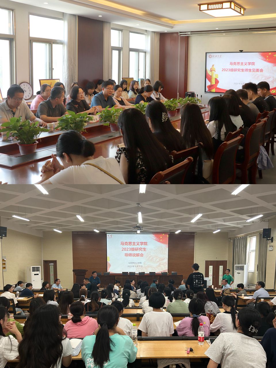 9月7日,研究生师生见面会,研究生导师说解会。学院党委书记张华筠,党委副书记、院长刘子平,党委副书记、副院长范华亮,副院长华敏、黄昊出席见面会。原理教研室教授王红霞,思想政治教育系主任高庆涛,辅导员李雨桐以及全体2023级研究生参加此次见面会。张华筠在致辞中代表学院对2023级研究生新生表示欢迎,并希望新生要求真学问,练真本领,要立身百行(航),以学为基,坚持“慎思明辨”,把学习放到一个更高的层次上,做“善学”的新时代马院学子。刘子平在讲话中简要介绍了学院办学历史、学科建设、师资力量等基本情况,并对新生提出了四点要求,一是要尽快转变角色,融入研究生的学习生活状态,更加注重对学习自主性和严谨性的培养。二是要围绕国家和现实需求,聚焦学术前沿,夯实学科基础,提升学术研究创新能力。三是要崇尚学术,求真务实,始终严格遵守学术道德规范。四是要努力做一个心思集中的人,在学习和生活中保持健康、自信的心态,敢于迎难而上。2023级学硕研究生孔扬代表新生作表态发言,承诺将刻苦学习、自强不息,遵规守纪、团结奋进,树立远大理想,努力在新时代建功立业。下午的导师说解会上,导师们就个人的研究方向、研究旨趣、选择学生的要求等一一进行自我介绍。尽管不同研究方向的导师所提出的要求各不相同,但大家对学生学习态度和学术功底的要求高度一致。此外,导师们还鼓励同学们在学术道路上勇敢尝试,不断探索,快乐学习。