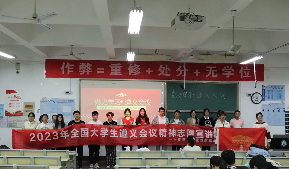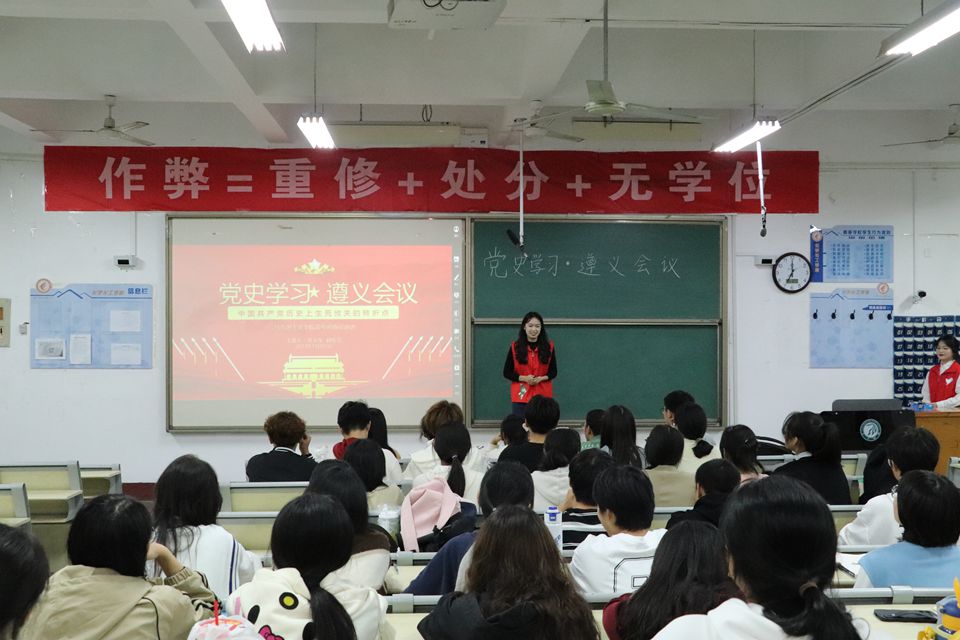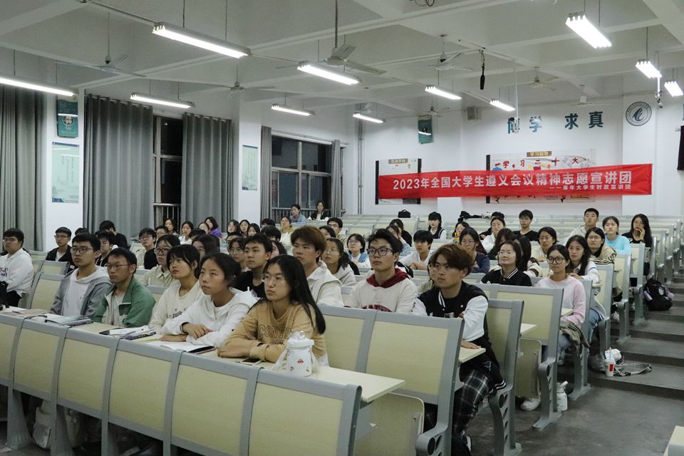 思想旗帜引领前进方向,勇担使命凝聚奋进力量。宣讲团成员以喜闻乐见的形式、生动活泼的语言,依托ppt和红色视频,围绕遵义会议的历史背景、会议过程、内容决议、历史地位以及遵义会议精神内涵等多个方面,对这段艰苦卓绝的峥嵘岁月进行了全面系统的宣讲解读,整场宣讲观点透彻、思路清晰,做到了有理有情有力,不仅带领同学们重温了这极具转折性的红色记忆,更展示出中国共产党坚持真理的精神特点。宣讲团成员指出遵义会议既是发扬民主、集思广益、凝聚集体智慧的表率,又是面对重大危机,万众一心、团结一致、齐心协力、众志成城的典范,希望同学们能够将遵义会议精神内化于心,在学习中不断探索真理,在实事求是中向前迈进。