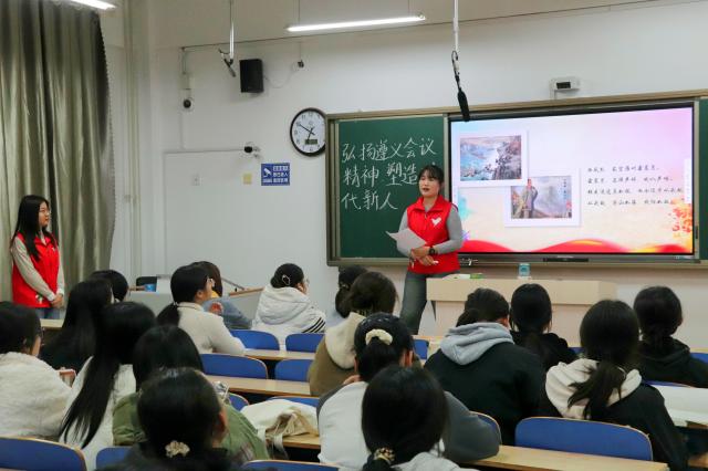 11月5日,春宫图 青年大学生时政宣讲团成员惠亨昀、李薇在学院A201室作遵义会议精神宣讲。欲神幻想 2023级学生代表参加此次宣讲会。